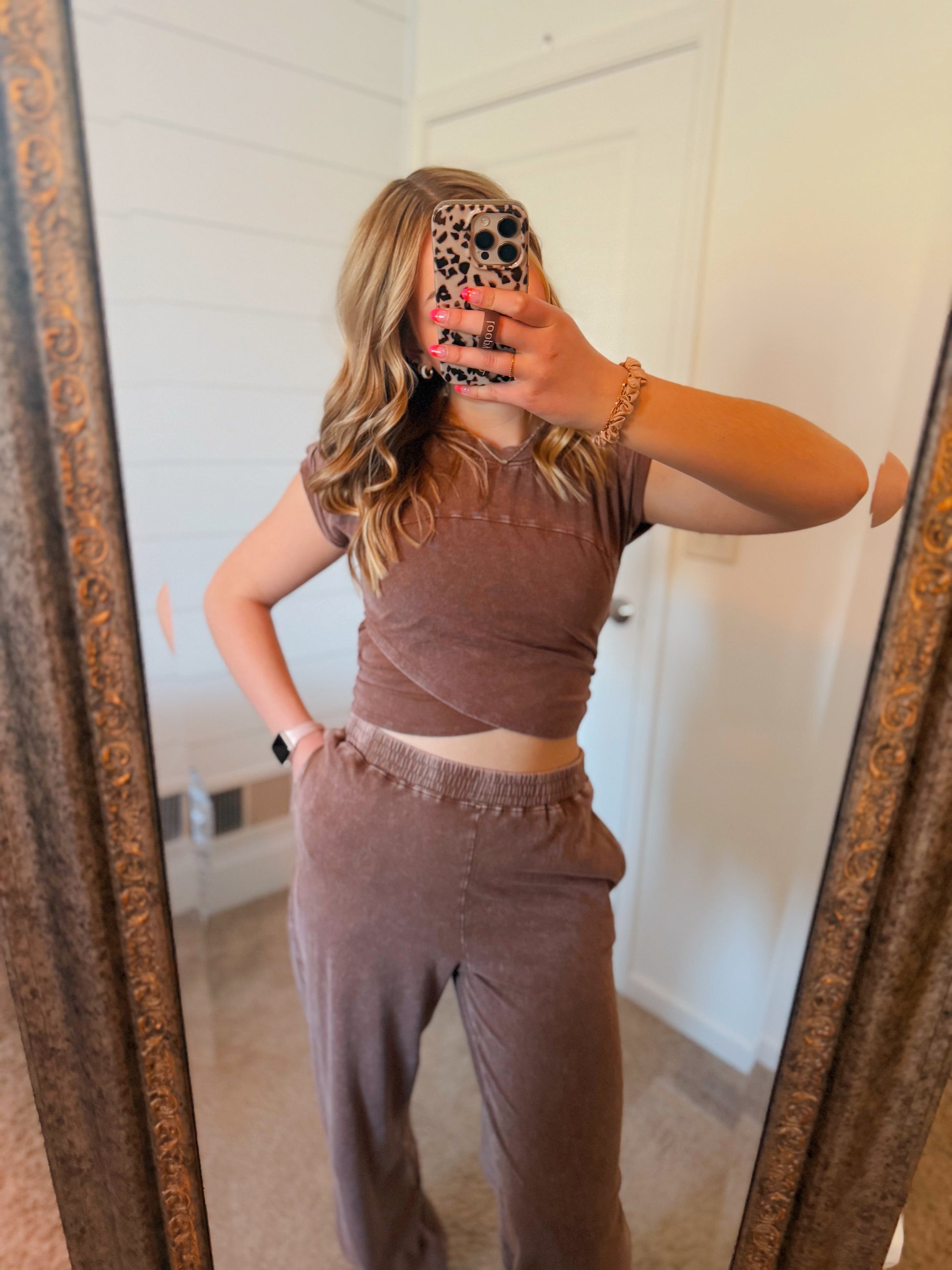 The Crossover Set is the perfect blend of comfort and effortless style. Made from a soft cotton-spandex fabric with a mineral wash finish, this set has a relaxed, lived-in feel you’ll love wearing all day. The top features a classic crew neckline, rolled extended shoulders, and a flattering wrap-front detail that adds a stylish touch. The matching joggers include a high-rise elastic waistband, convenient side pockets, and a cinched elastic hem for a comfortable, modern fit. Pair it with your favorite statement sneakers for an easy, everyday outfit that looks as good as it feels.